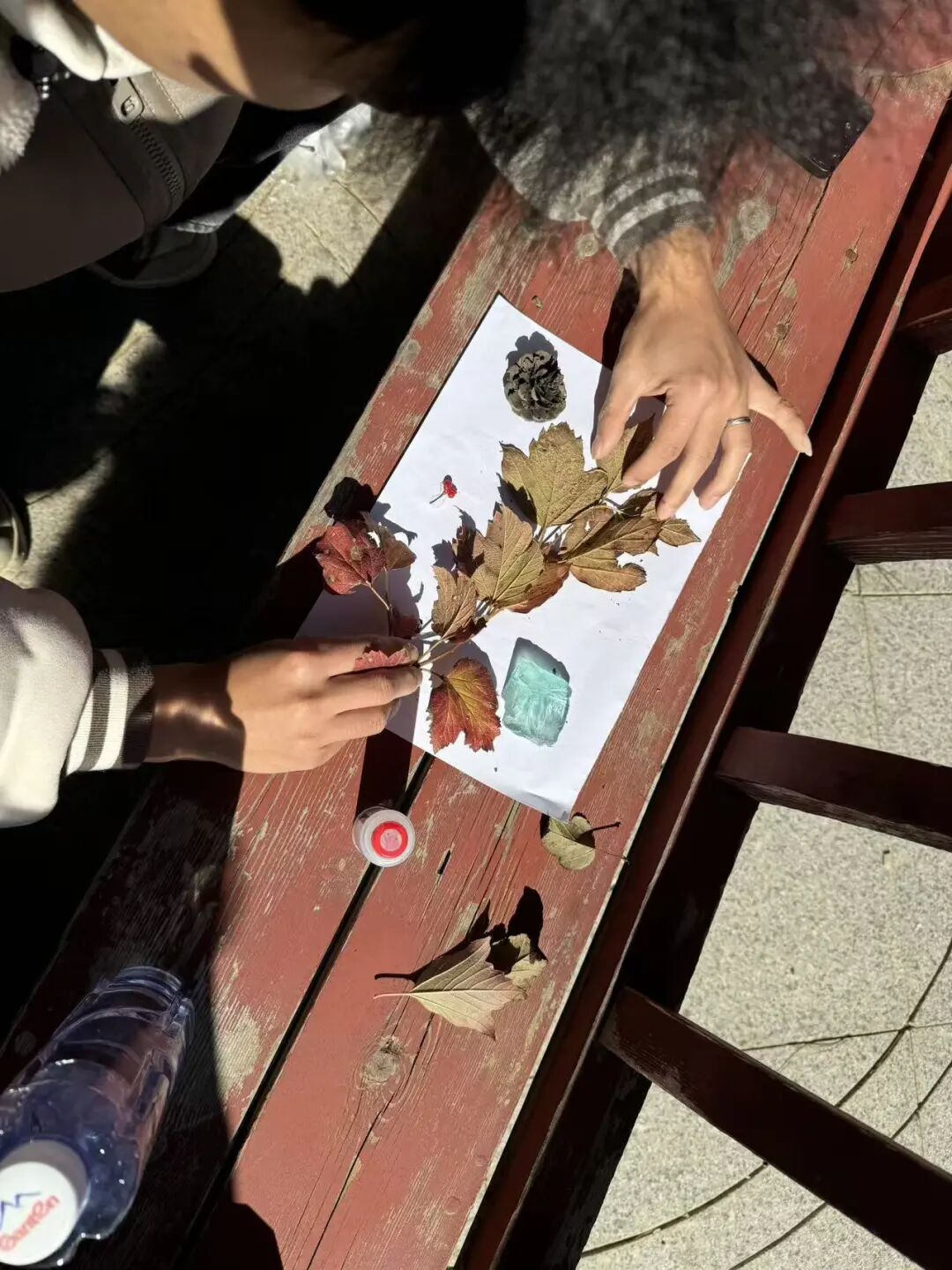 随后的自然创作环节,是情感表达与创造性思维的舞台。大家以拾取的自然素材为画笔,在白纸上自由挥洒。有人勾勒出层林尽染的秋日森林,有人描绘摇曳生姿的溪畔风光。一幅幅独一无二的作品,不仅是秋景的再现,更是新生内心世界的投射与情感的表达,在艺术创作中实现了情绪的疏导与释放。