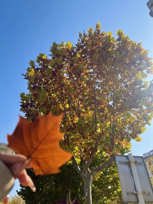 这是一片被秋日点亮的时光。一只手轻轻捏着一片橙黄色的落叶,将它托在眼前。叶片脉络清晰,边缘微微卷曲,像一枚精致的书签,定格了季节的讯息。视线穿过这片叶子,一棵高大的树木撑开繁茂的树冠,枝叶由黄绿渐变为深褐,在湛蓝晴空的映衬下,层次格外丰富。阳光从斜后方洒下,为叶片边缘镀上柔和的光晕,也让粗糙的树干显露出温暖的质感。