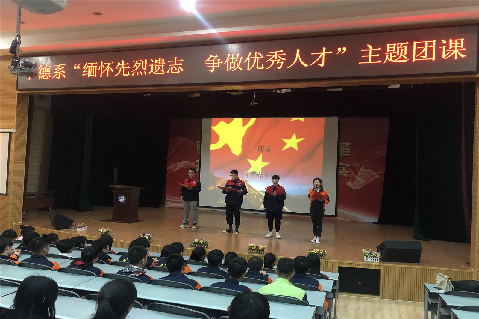 黄河的水、昆仑的山、祖国的飞雪、南国的椰林都是祖国靓丽的风景。他不仅滋润着华夏儿女的血脉,也使祖国朝气蓬勃、永葆青春。由学生会的四位共青团员带来的配乐诗朗诵《青春中国》感染着全场每一个人。