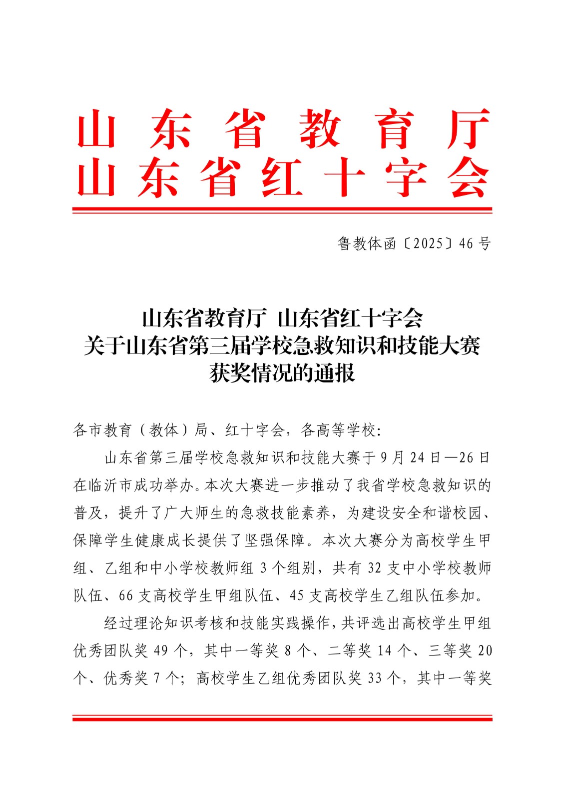 近日,由山东省教育厅、山东省红十字会主办,临沂职业学院承办的山东省第三届学校急救知识和技能大赛在临沂圆满落幕。本次大赛分为高校学生甲组、乙组和中小学校教师组3个组别,共有 32 支中小学校教师队伍、66支高校学生甲组队伍、45支高校学生乙组队伍参加。